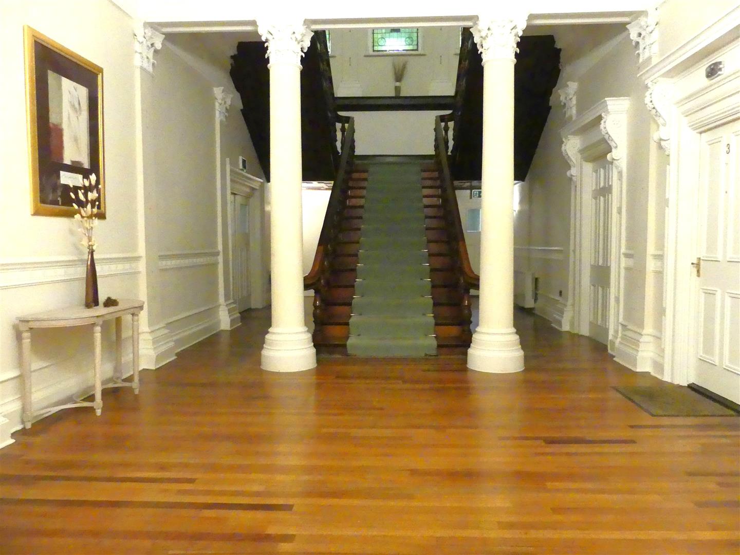 There is a long L shaped hallway with an entry phone, three radiators, two light wells and a cloaks cupboard,