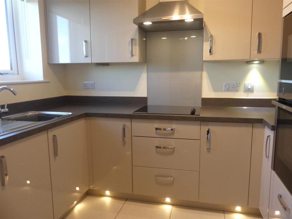 Fitted with a range of modern cream gloss base and wall units having complementary work surfaces, under unit lighting and a stainless steel sink unit with lever tap. Appliances comprise an integrated oven with ceramic hob and cooker hood over, microwave and integrated fridge freezer. Tiled floor , low level lights and a window to the front elevation.