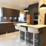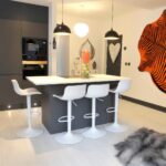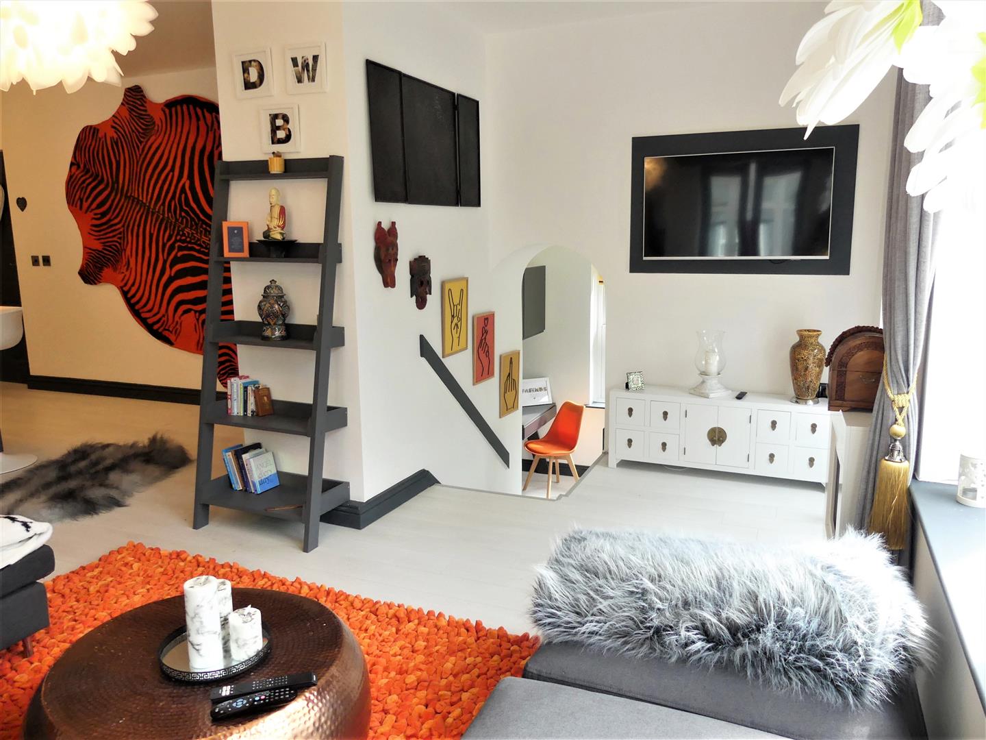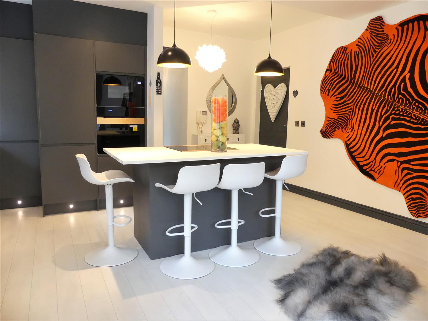 The stylish bright and airy living area has windows to the side and rear elevation flooding the room with light. There is a video entry phone, free-standing electric fire, laminate flooring, telephone point and three radiators. The kitchen area is fitted with a modern range of base and wall units having low level and under cabinet lighting, complementary work surfaces and sink unit, plus an island with breakfast bar. Integrated appliances comprise a fridge freezer, oven, microwave / grill, washer dryer, dishwasher and induction hob.