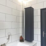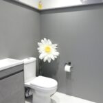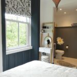 An immaculately presented en-suite dressing room having a vanity unit with basin, low suite w.c. and fitted wardrobe.
