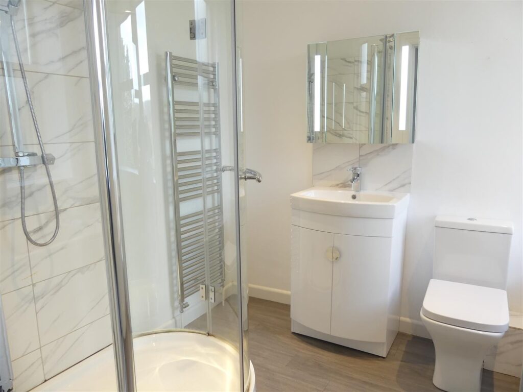 Fitted with a shower cubicle with thermostatic shower, low suite w.c. and wash basin. Mirrored cabinet with light and shaver point, chrome heated towel rail, cupboard housing the central heating boiler and an additional storage cupboard.