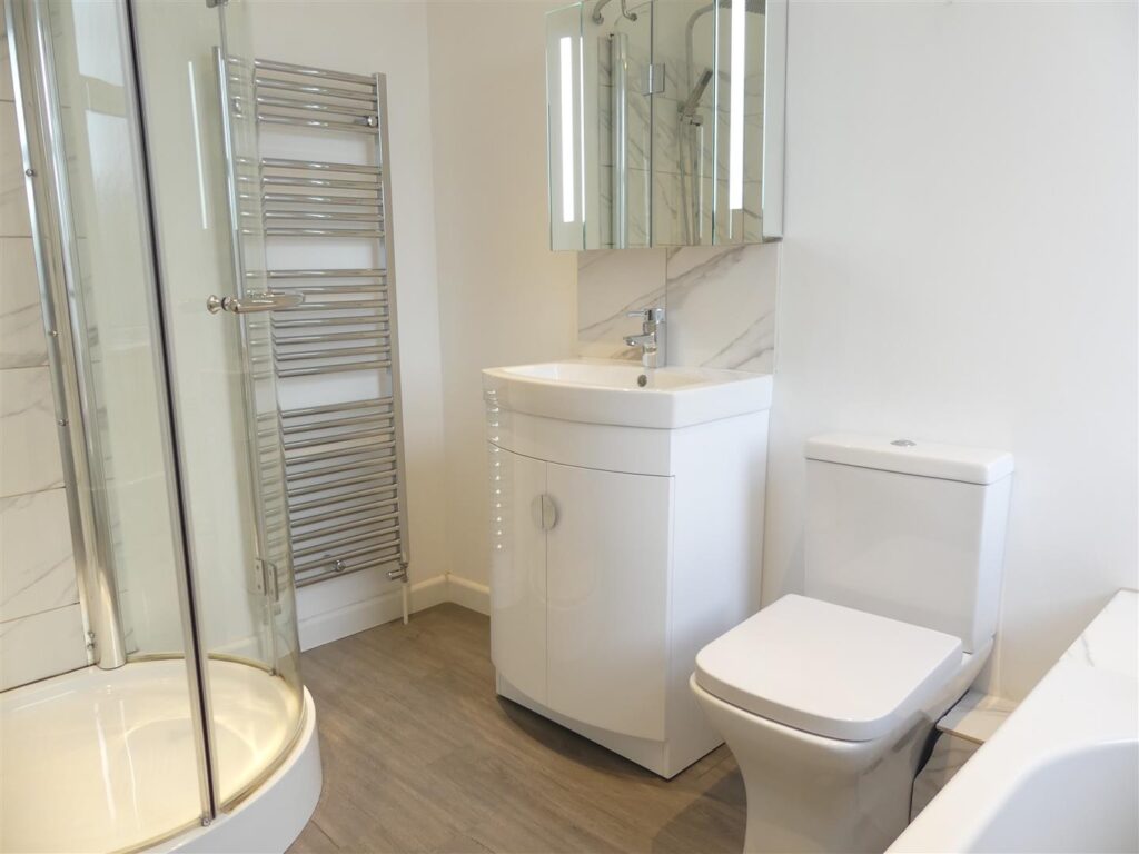 Fitted with a suite comprising a panelled bath, walk-in shower with rainfall shower head, vanity unit with wash basin and a low suite w.c. There is also a heated towel rail.