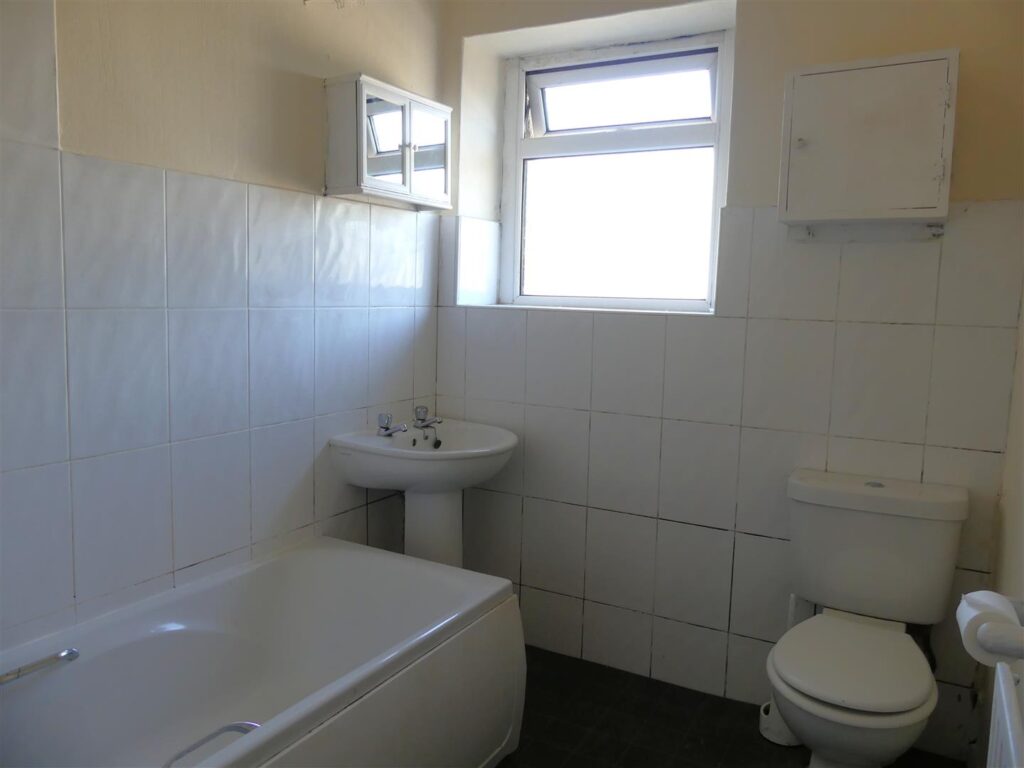 Fitted with a white suite comprising a panelled bath with an electric shower over, pedestal wash basin and low suite w.c. Vinyl flooring, part tiled walls, radiator, small wall mounted cabinet and a window to the rear elevation.