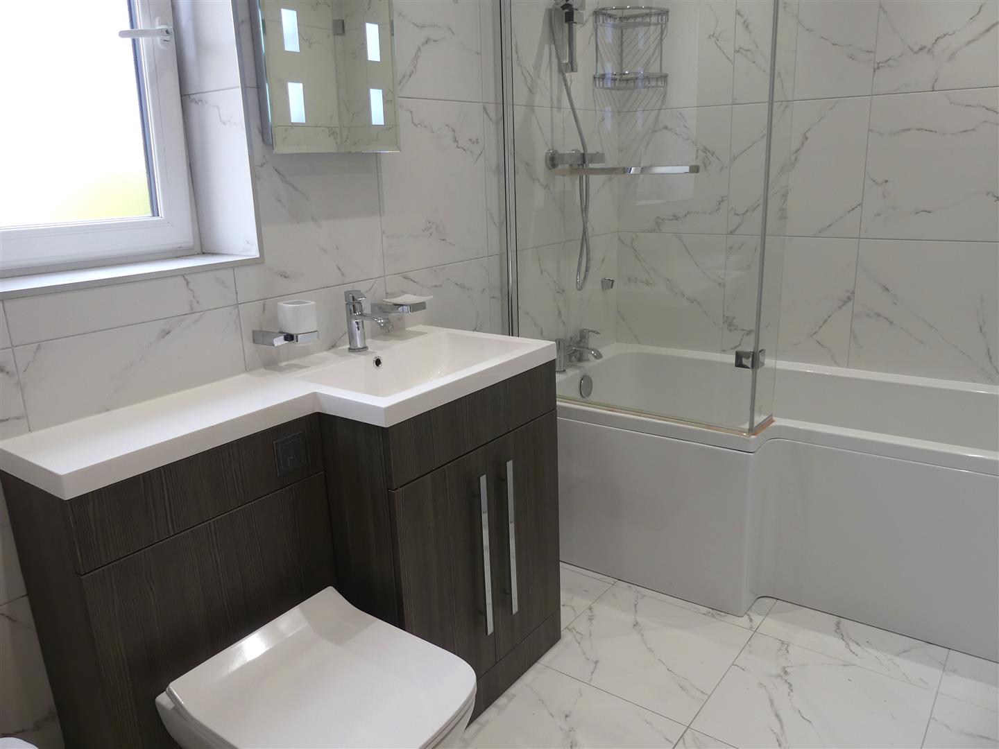 The fully tiled bathroom is fitted with a white suite comprising a shower bath with shower over and a glass screen, low suite w.c. and a vanity unit with wash basin. There is also an illuminated mirror, extractor fan, heated chrome towel rail and underfloor heating.