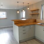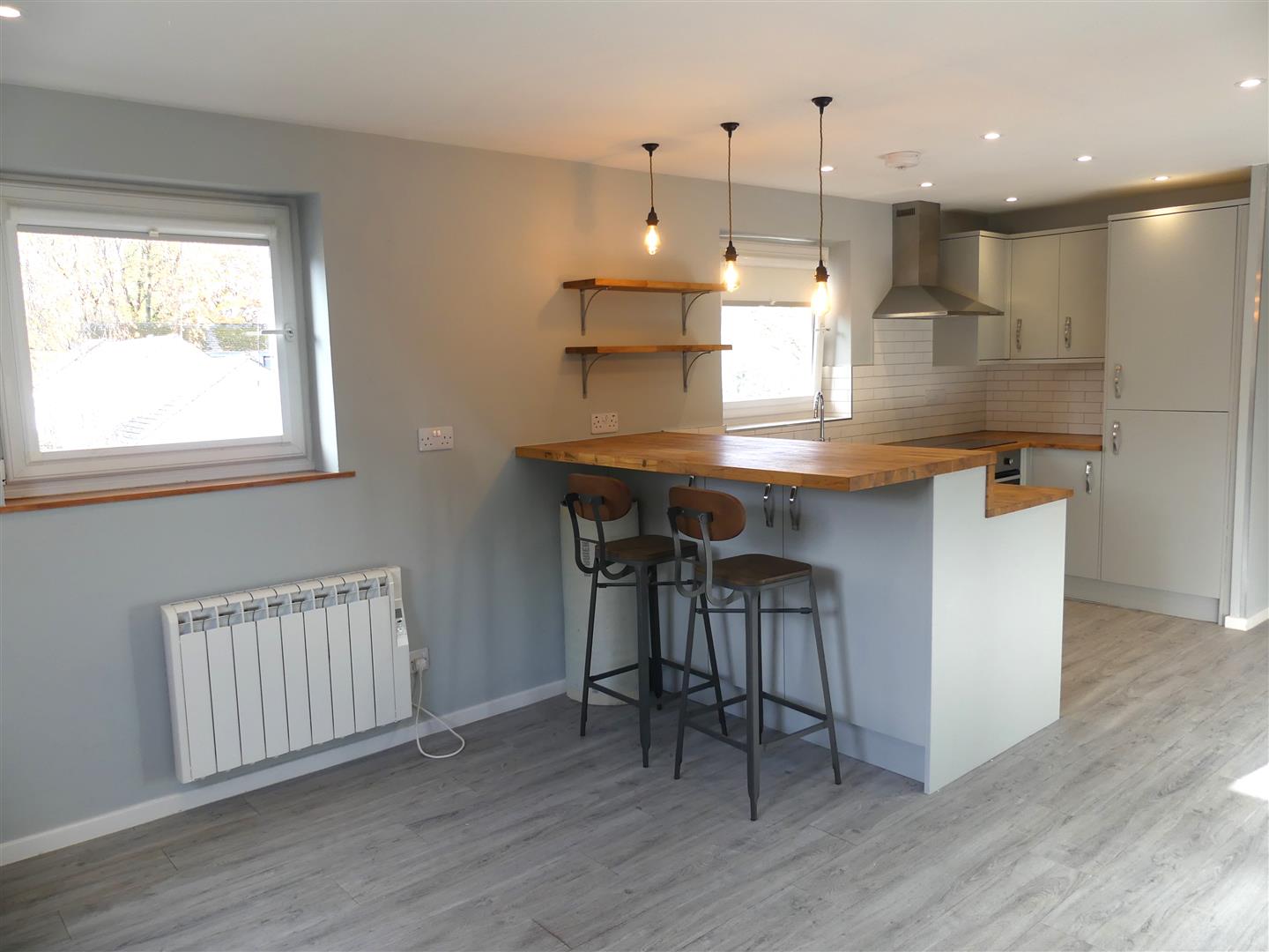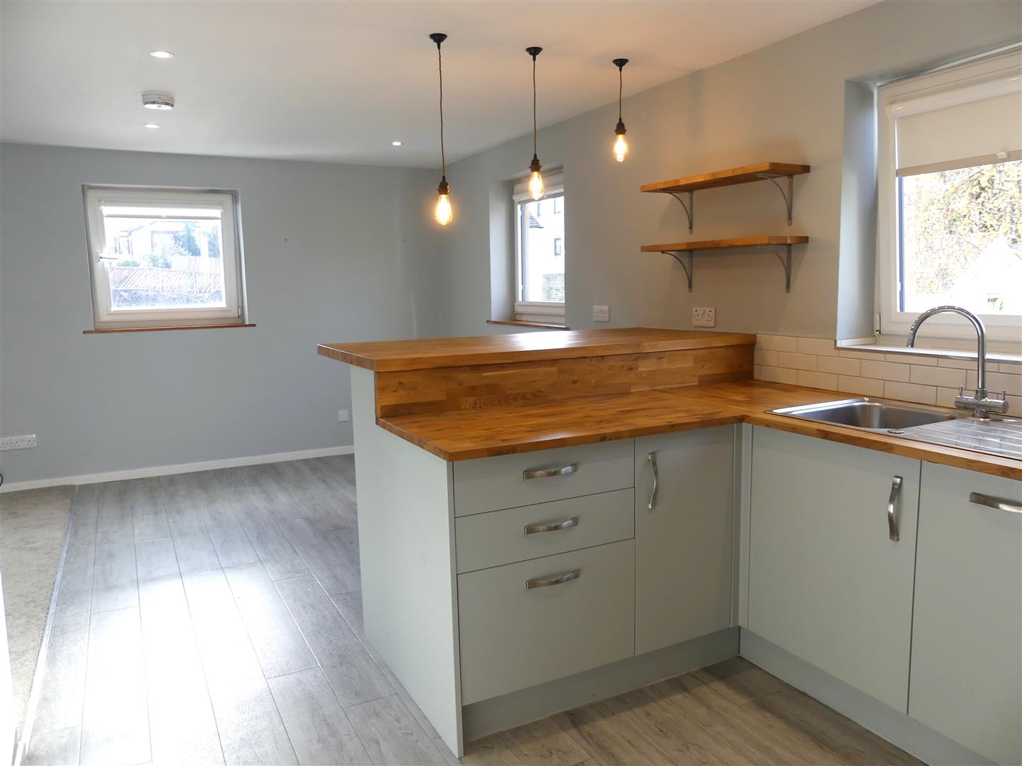 Fitted with a range of modern dove grey base and wall units with wooden work surfaces and stainless sink unit. Integrated appliances comprise an electric oven, induction hob with cooker hood over, fridge freezer and a slimline dishwasher. There is also a breakfast bar, LED spotlights, wood effect flooring and two windows to the side elevation.