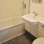Fitted with a white suite comprising a panelled bath with shower over, low suite w.c. and wash basin. There is also a shaver point, heated chrome towel rail and a window to the rear.