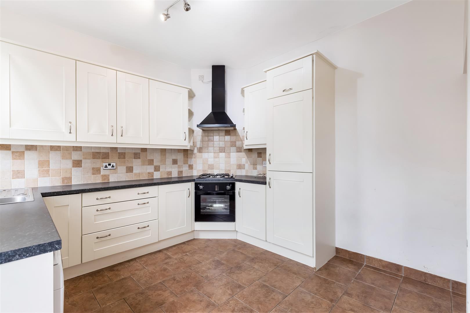 Fitted with a range of base and wall units having complementary work surfaces, tiled splash backs and inset stainless steel sink unit with mixer tap. Appliances comprise an integrated electric oven with gas hob and cooker hood over and a fridge freezer. There is also plumbing for a washing machine and dishwasher. Tiled floor, window to the rear and a door leading out to a paved garden area to the rear.