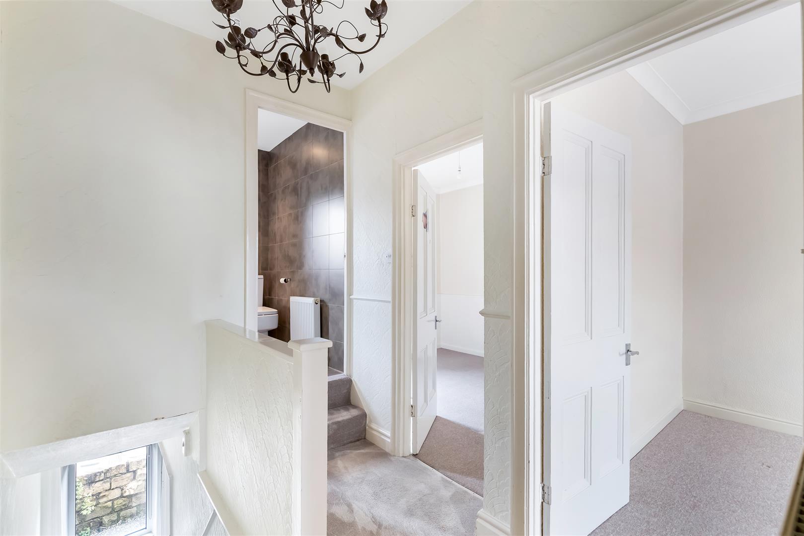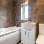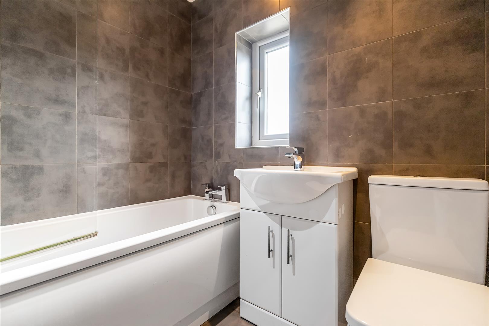 Fitted with a modern white suite comprising a panelled bath with electric shower over, vanity unit with wash basin and a low suite w.c. There are also recessed spotlights, radiator, ceramic tiling to the floor and walls and a window to the rear elevation.