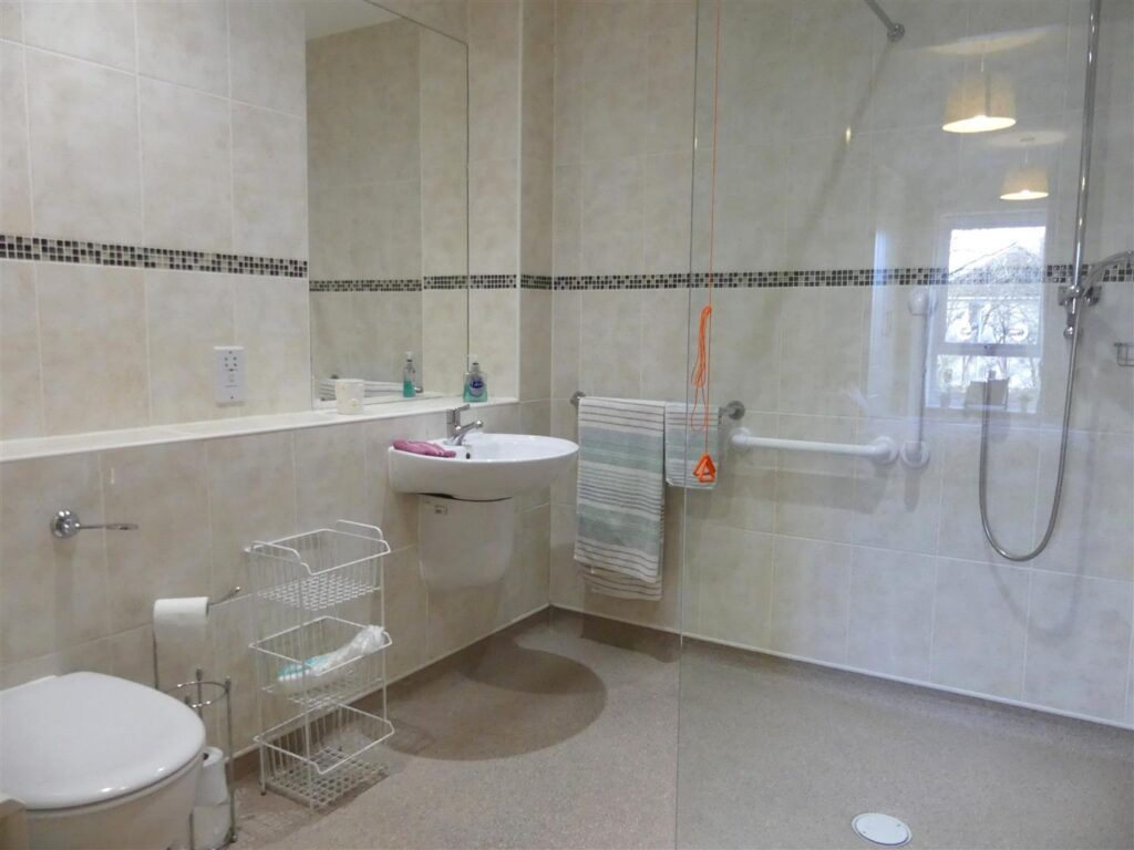 Accessible from both the bedroom and the hall the spacious shower room has a walk in shower with fixed glass screen, w.c. and wall hung basin. There is also a heated towel rail, radiator, shaver point, extractor fan, recessed spotlights, vinyl flooring and fully tiled walls.