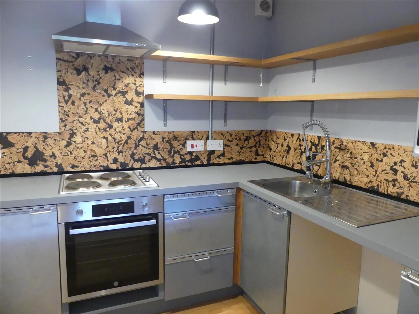 Modern fitted kitchen, with base units, sink with mixer tap, electric oven, hob and extractor, wooden shelving, space for fridge/freezer and plumbing for washing machine.