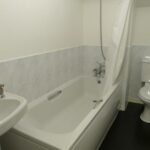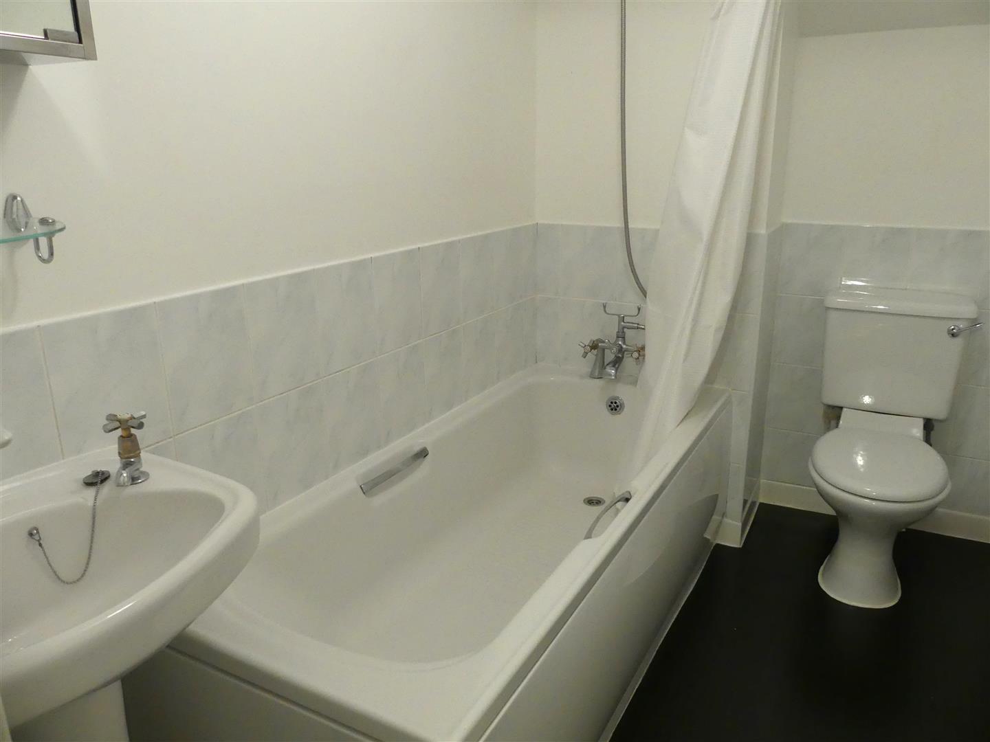 With modern white suite comprising, bath with mixer shower over, pedestal basin, low flush wc, extractor fan and electric fan heater.