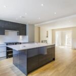 With recessed spot lights and a cupboard housing a washer dryer.