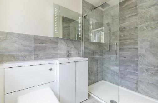 Fitted with a modern suite comprising a panelled bath with rainfall shower over and glazed screen, vanity unit with wash basin and a low suite w.c. There is also a heated towel rail, extractor fan, recessed spot lights, wood effect tiled floor, part tiled walls and a window to the front elevation.