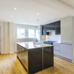 The beautiful modern kitchen is fitted with a range of gloss fronted base and wall units having complementary work surfaces and upstands plus a large island unit with inset sink unit. Appliances comprise a range cooker with five ring gas hob and stainless steel cooker hood, integrated fridge freezer and integrated dishwasher. There is also a radiator, recessed spot lights, wood effect flooring and a door and window to the front. Open to: